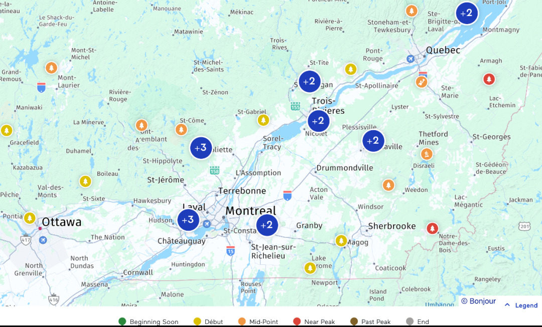 根据魁省旅游局(https://www.bonjourquebec.com/en-ca/explore/seasons/fall)在9月26日发布的全省枫叶变色更新报告,目前一些地区的枫叶已接近{"接近绚烂的顶峰(Near Peak)"}的状态: