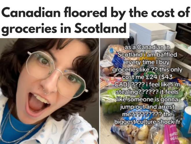 在除墨西哥、法国、澳大利亚、马来西亚等食品相对便宜的地区外,有一位加拿大网友在苏格兰爱丁堡购物时,也惊讶于当地的物价水平。