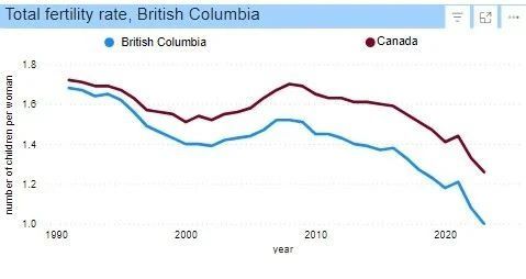 在过去十五年内,加拿大的生育率持续下降,并在2023年创下新低。其中,BC省的生育率最低,平均每名女性仅生育1个孩子。