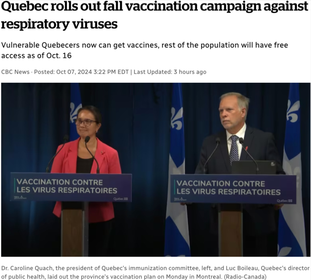 Boileau补充道,魁北克省正在根据世界卫生组织的建议,在北半球开展秋季疫苗接种活动。他表示:“这将有助于保护许多易感人群免受并发症,当然也将继续拯救生命……并减少今年冬季急诊室的压力。”