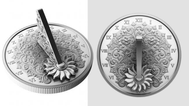 这枚硬币配备了一根镀铑的黄铜晷针,当它在阳光下并指向正北时,晷针会在硬币底部形成影子,从而指示时间。“与所有日晷一样,因经度和一年中不同的时间,可能需要进行一些额外调整。”