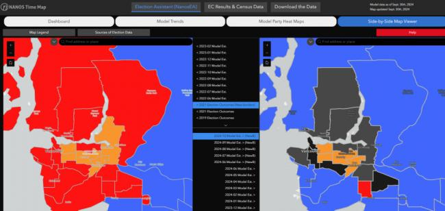 在加拿大及汉密尔顿地区,2021年几乎全数自由党的席位目前已转变为保守党及未决席位的组合。下方的图片显示,左侧为2021年联邦选举的结果,右侧为基于当前模型的变化情况,黑色区域的选区被认定为过于接近,难以预测。