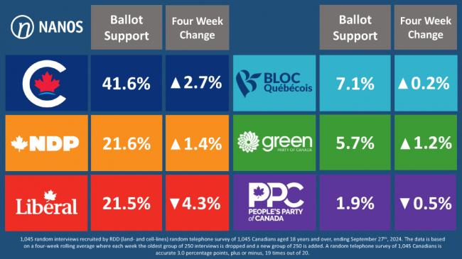 根据最新的Nanos选票追踪数据,保守党的支持率达到了41.6%,相比之下,自由党的支持率降至21.5%,保守党在此项指标上领先超过20个百分点,且自由党的支持率在四周内下降了四个百分点。