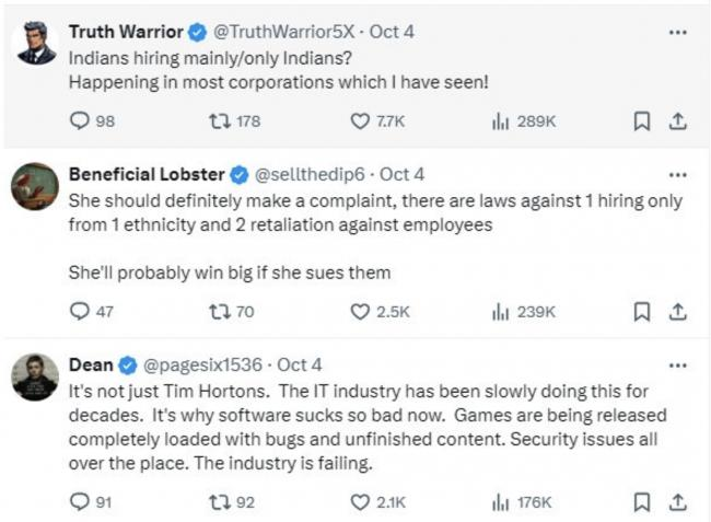 根据用户Klaus Arminius的帖子,一位加拿大女性在工作时指出,Tim Hortons的印度籍管理人员主要雇佣同族的印度移民,结果遭到解雇。
