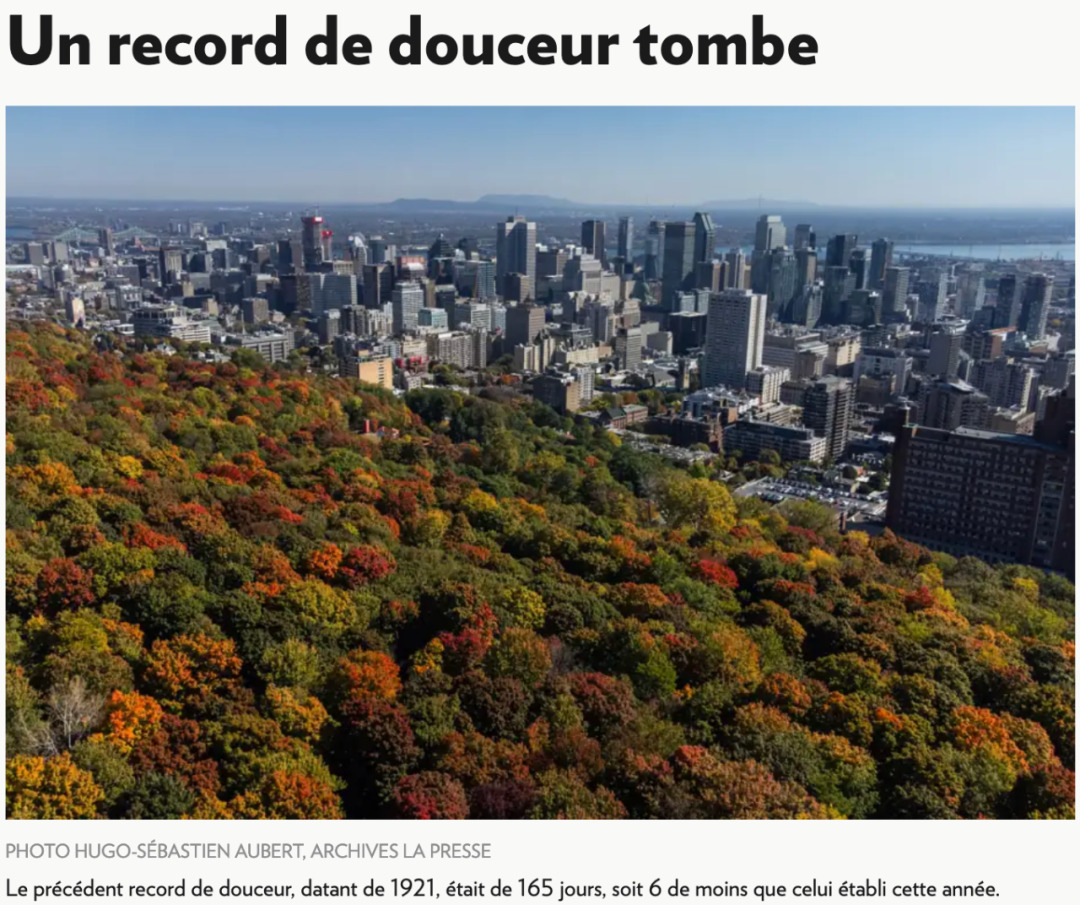 从4月27日至10月14日的171天期间,蒙特利尔的气温始终保持在4°C以上。这个纪录在本周二宣告结束,但预计温和天气将会再次回归。