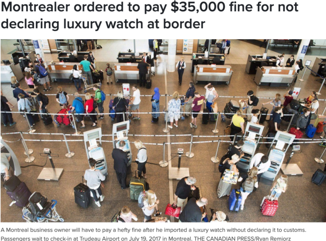 蒙特利尔的一名商人在进口一块奢侈手表时未向海关如实申报,因此被判处高额罚款。 本周,一位联邦法院法官裁决,David Segall Blouin需为他在两年前购买的价值115,000加元的手表支付35,000加元的罚款,并加上11,400加元的魁北克省销售税。