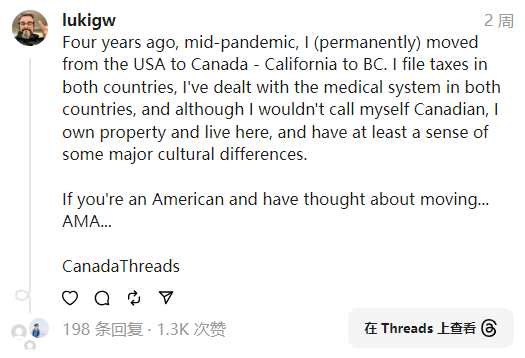 “我在两个国家都报税,并与两国的医疗系统打过交道。如果你是美国人,考虑迁居,欢迎向我询问任何相关问题。”他的帖子自发布以来已经获得了超过1000个赞和100多条评论。