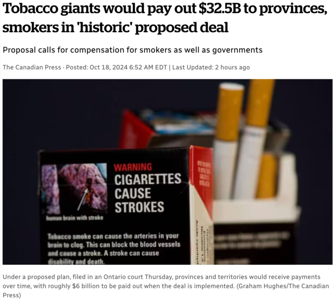三家大型烟草公司提议向各省和地区支付近250亿美元,其中包括向成千上万的魁北克省烟民及其家庭支付超过40亿美元,以推动由于长期法律诉讼引发的企业重组程序。