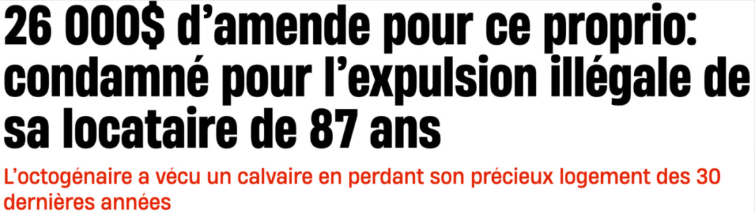 在蒙特利尔南岸的Longueuil,一名男子因非法驱逐87岁的房客而被判赔偿$26,000。法官强调,这起案件向房东们传达了“明确的警示”。