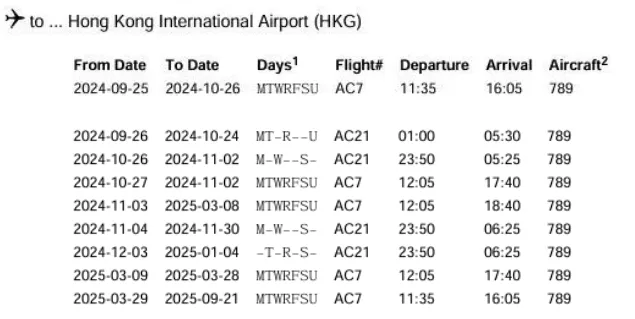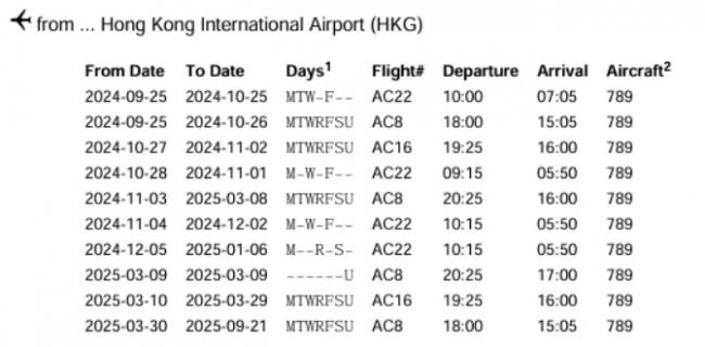 从温哥华到香港的航班是华人回国的一条重要航线,但加拿大航空宣布,从2025年1月6日起,其每周执飞的往返温哥华与香港的AC21和AC22航班将暂停。2024年11月3日起,该航线的AC16航班也将正式停飞,并计划至2025年3月10日再恢复为每天一班。
