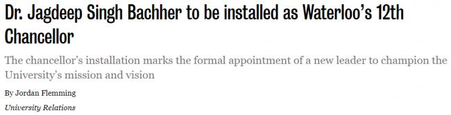 滑铁卢大学在其官方网站上宣布,Jagdeep Singh Bachher博士将于2024年10月25日(星期五)正式担任第12任校监,这一任命标志着滑铁卢大学领导团队的新阶段。