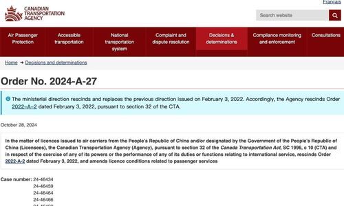 早在2022年1月28日,加拿大交通部就对中国航空公司实施了一系列航班限制,例如将中国航空公司每周可定期往返的航班总数限制为不超过6班。如今,该限制已被解除。