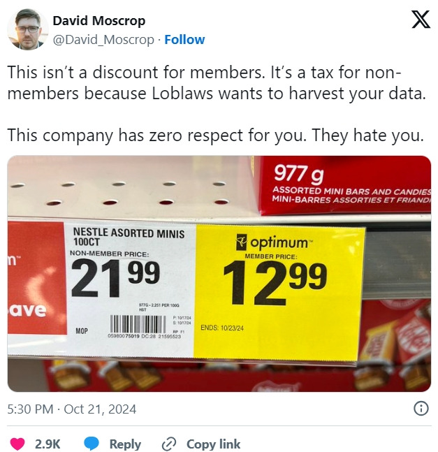 他补充道,“这不是会员折扣,这其实是对非会员的额外收费,因为Loblaws希望收集你的个人数据。”