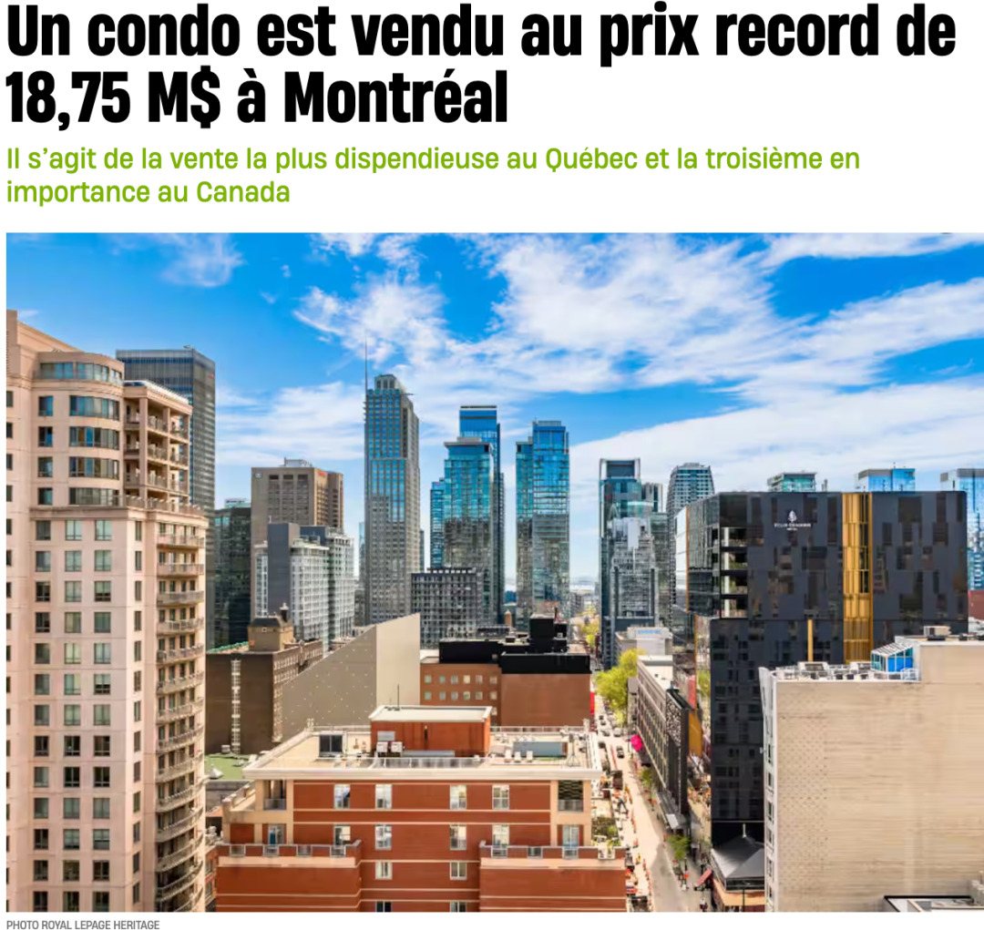 根据《Le Journal de Montréal》的报道,蒙特利尔的一套奢华公寓以1875万美元的成交价,创下了魁北克省历史上最昂贵的公寓交易记录。