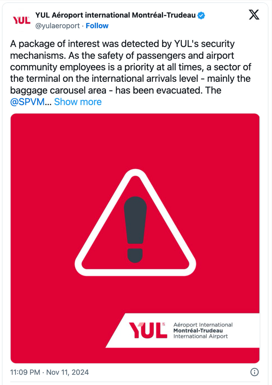 大约在周一午夜时分,机场管理层通过社交媒体平台X发布消息,表示与蒙特利尔警方(SPVM)联合进行的评估确认这一威胁不具真实性。具体有多少航班受影响及可疑包裹的详细信息则尚未披露。