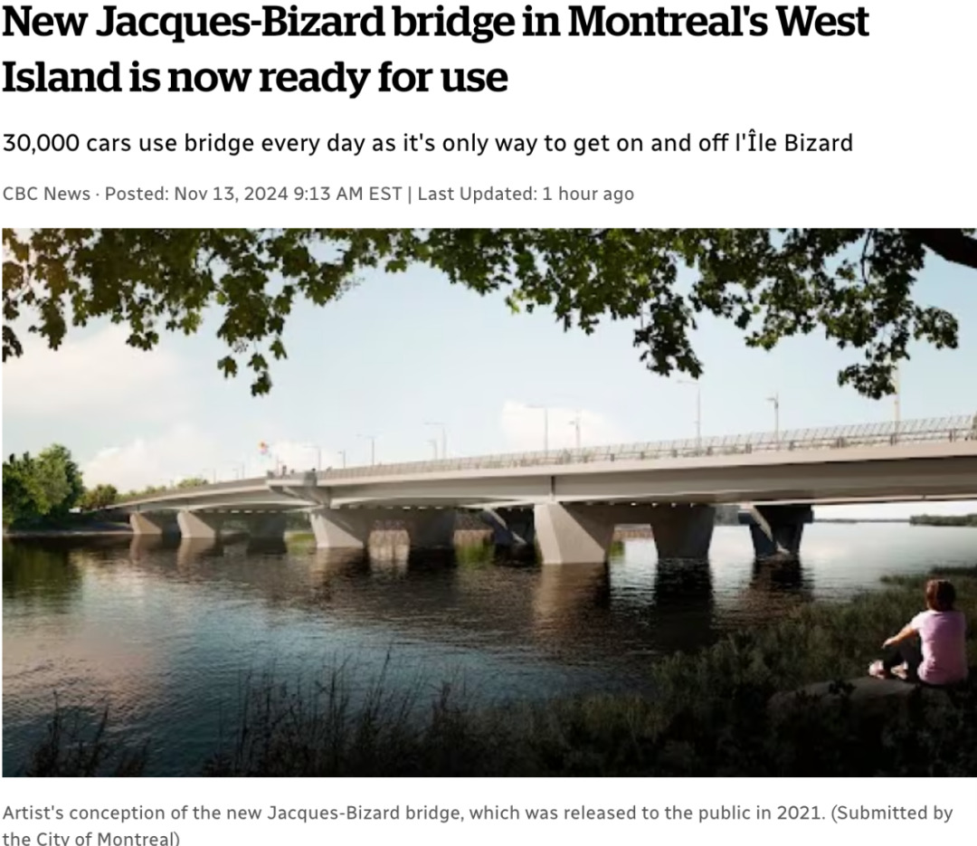 新建的Jacques-Bizard大桥是往返于Île Bizard岛的唯一通道,目前已经开始通车。