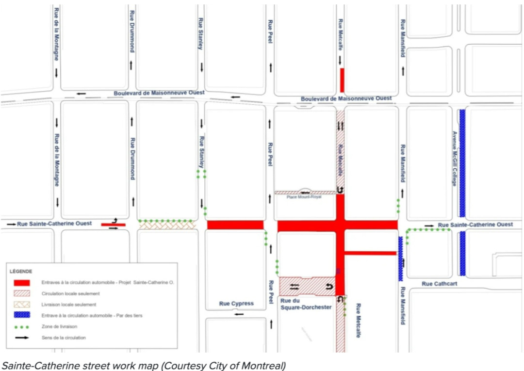 蒙特利尔市政府发布了关于市中心标志性商业街Sainte-Catherine西街开发项目的最新动态,从Stanley街到Mansfield街之间的封闭路段已于本周五重新对行人开放,预计下周一将对驾驶者开放。