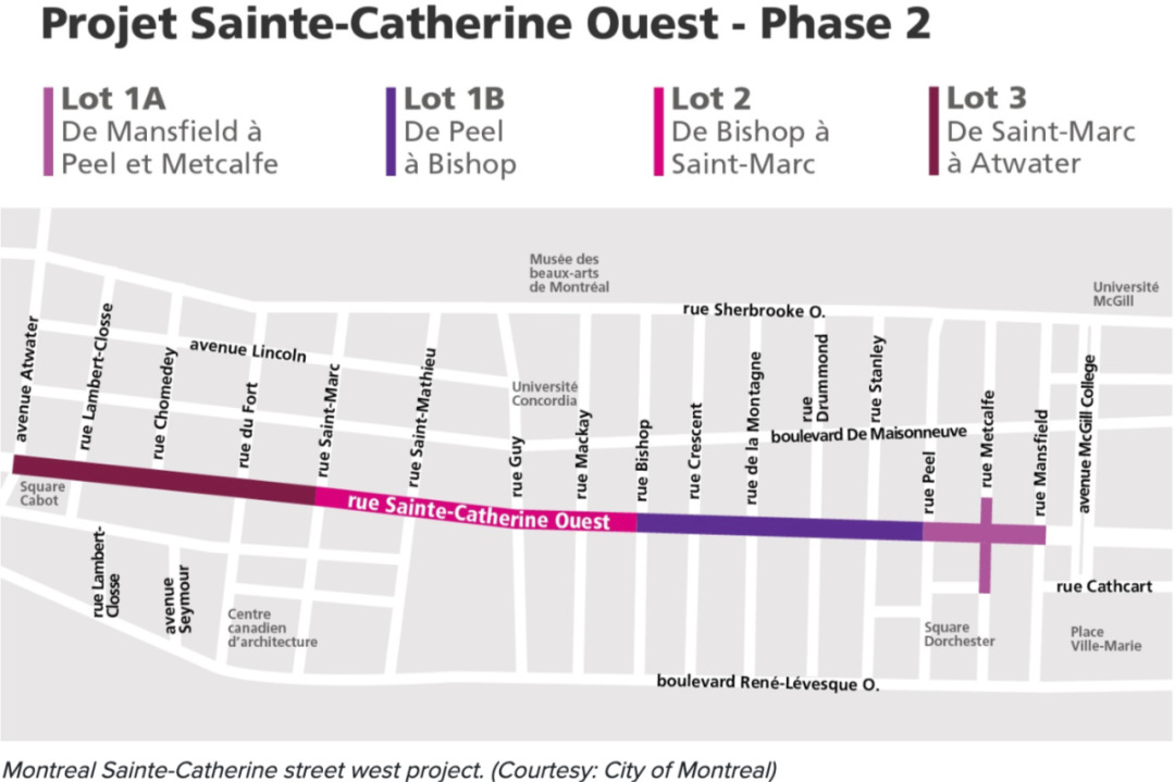 这个项目的第一阶段始于2018年,涉及在Mansfield和Bleury之间的Phillips广场和Union地区。在此项目中,市政府计划对Sainte-Catherine西街进行翻新,扩展至Atwater。