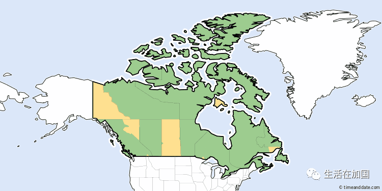 并非加拿大所有地区都遵循夏令时。育空地区、萨省的大部分、魁省的某些区域以及BC省部分地区全年只采用标准时间,具体情况可参考下方地图(黄色部分)。