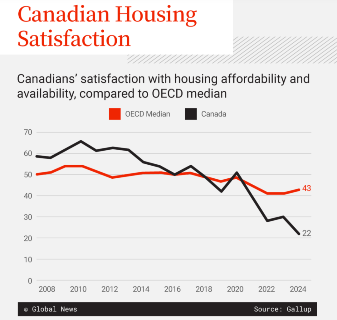 盖洛普的报告显示,加拿大人在过去十年中对经济适用房供应的满意度持续下滑,目前仅为22%,达到了新低。