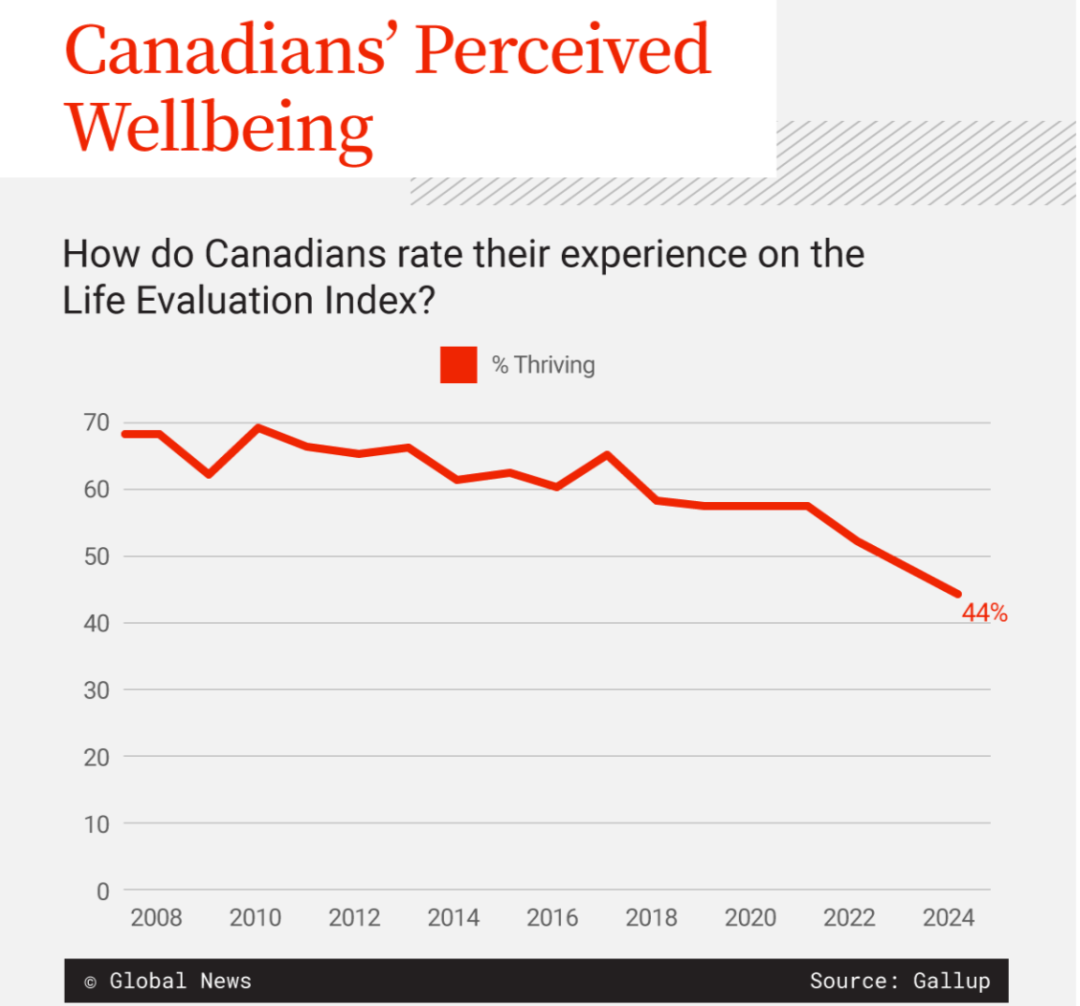 尽管多年来,加拿大人通常对生活给予积极评价,但去年仅有44%的人认为生活满意,再创新低。