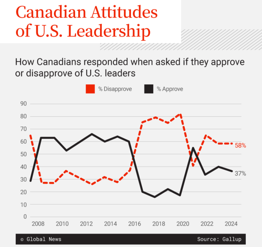 尽管这项调查是在美国前总统唐纳德·特朗普(Donald Trump)实施关税政策并对加拿大进行攻击的几个月前进行的,但报告显示,加拿大人对经济和美国领导地位的看法持续下滑已达多年之久。