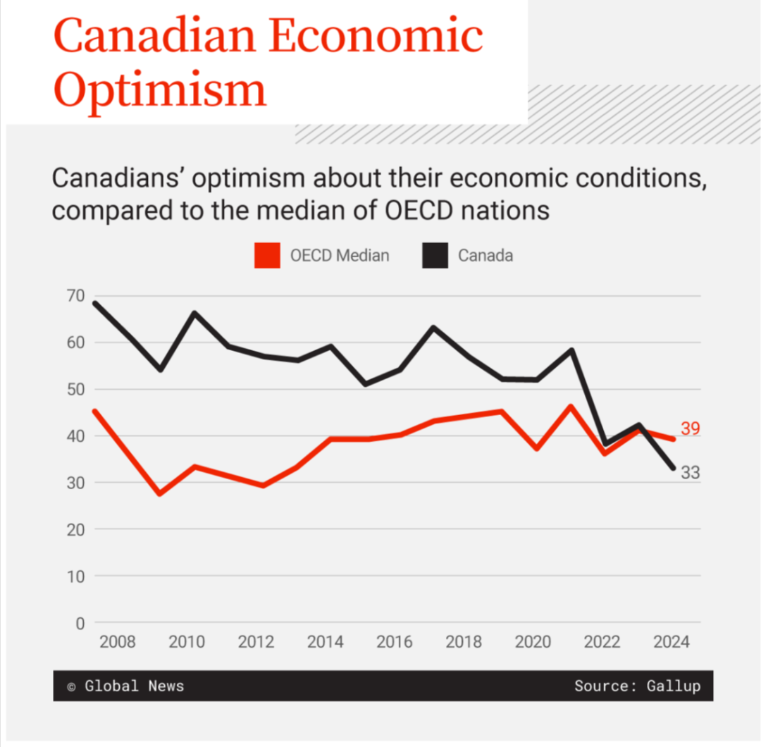 去年,加拿大的乐观情绪创下新低,仅有33%的受访者对经济前景持信心,这是加拿大历史上首次低于经合组织的中位数。