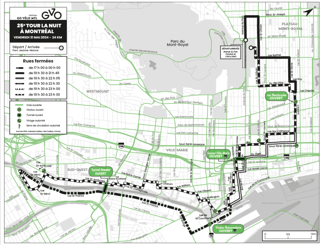 本周五晚上24公里的夜间自行车赛(Tour la Nuit)将以蒙特利尔市中心的Jeanne-Mance公园作为起点和终点。