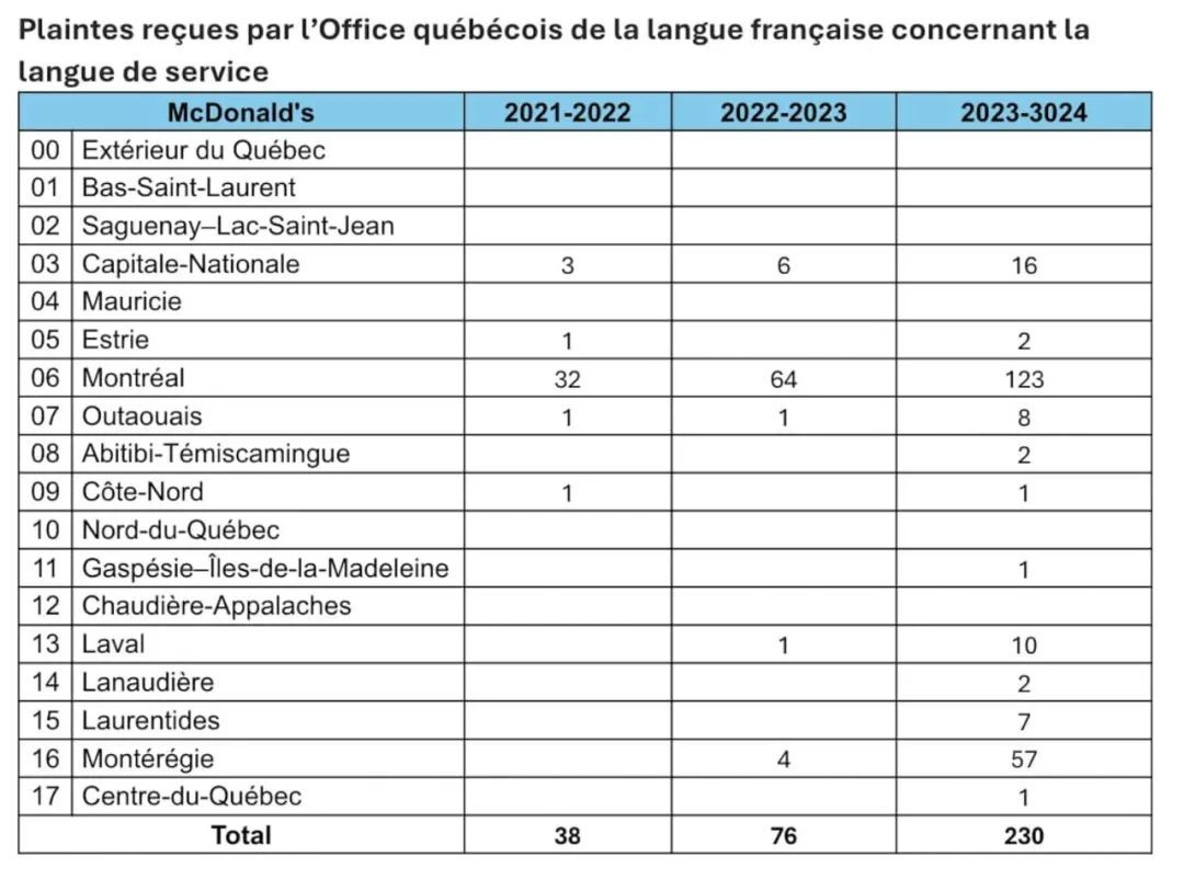 根据《蒙特利尔日报》的报道,尽管法律规定消费者有权获得法语的服务和信息,但一些餐馆却未能遵守这些规定。魁北克法语办公室(OQLF)的数据显示,在过去三年里,麦当劳服务语言的投诉数量从2021-2022年的38起增加到2023-2024年的230起。