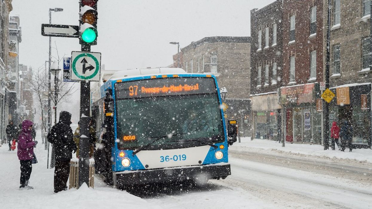 An STM bus stops at an intersection on a snowy day. Marc Bruxelle | Dreamstime