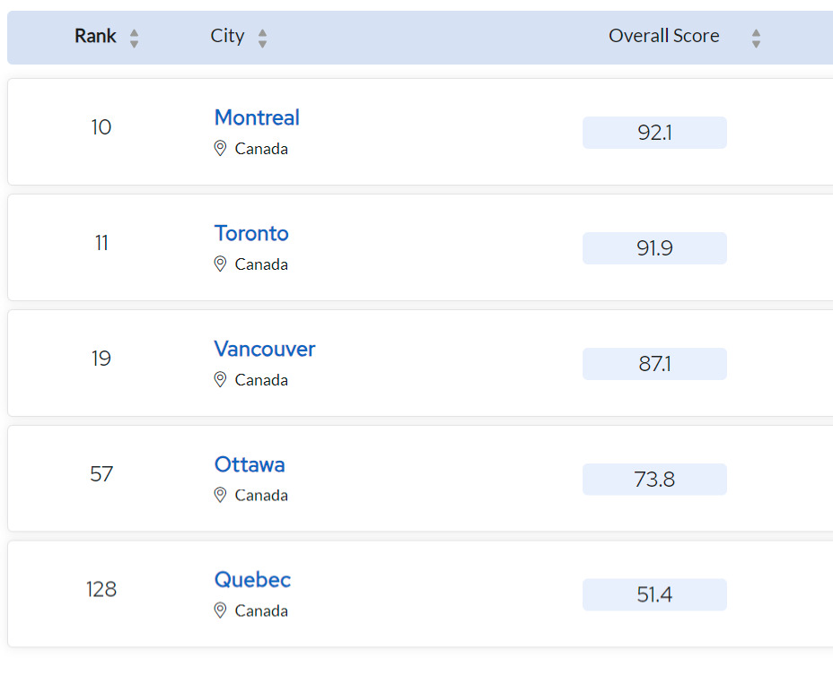 多伦多排名第11,温哥华排名第19,渥太华排名第57,魁北克市排名第128。