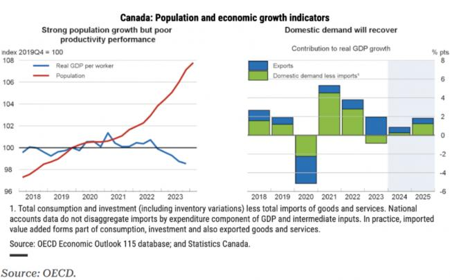 加拿大人口激增,但经济并不景气。大规模移民通常会促进经济增长,但在加拿大并未出现这种情况。经合组织强调,2023年加拿大的实际GDP增长仅为1.1%,几乎只有人口增长的三分之一,同时失业率上升至6.1%。