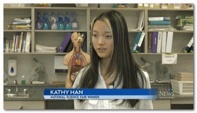 加拿大萨斯卡通地区的一名九年级学生Kathy Han展现出非同凡响的生物学天赋,她在全国科学竞赛中获奖并受到高度认可。