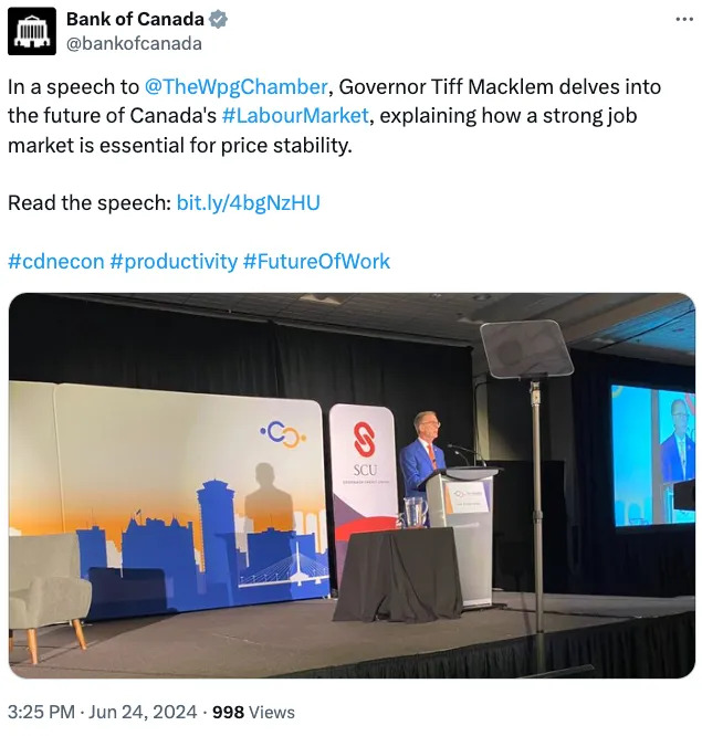 央行行长蒂芙·麦克莱姆(Tiff Macklem)周一在温尼伯商会发表演讲时探讨了加拿大的就业市场状况。