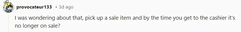 “我就好奇,我买了个特价的东西,等结账时已经不是特价了,怎么办?”