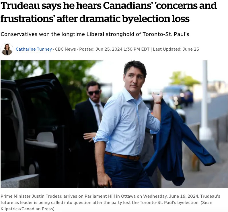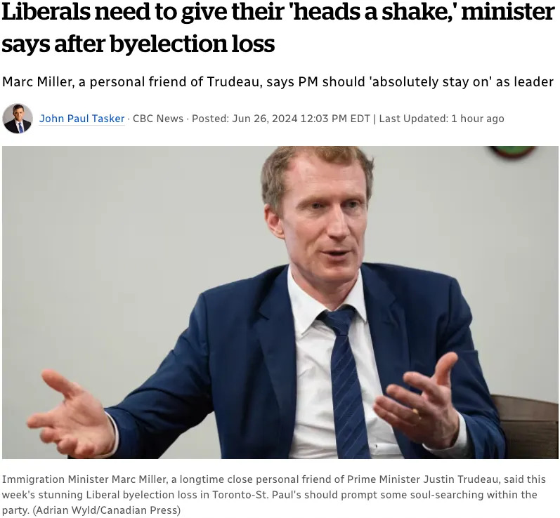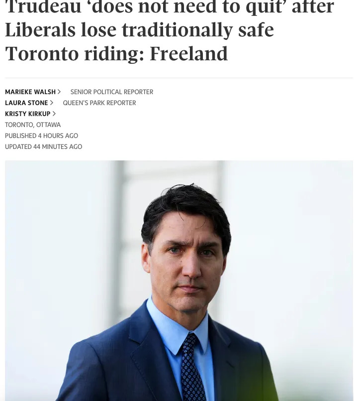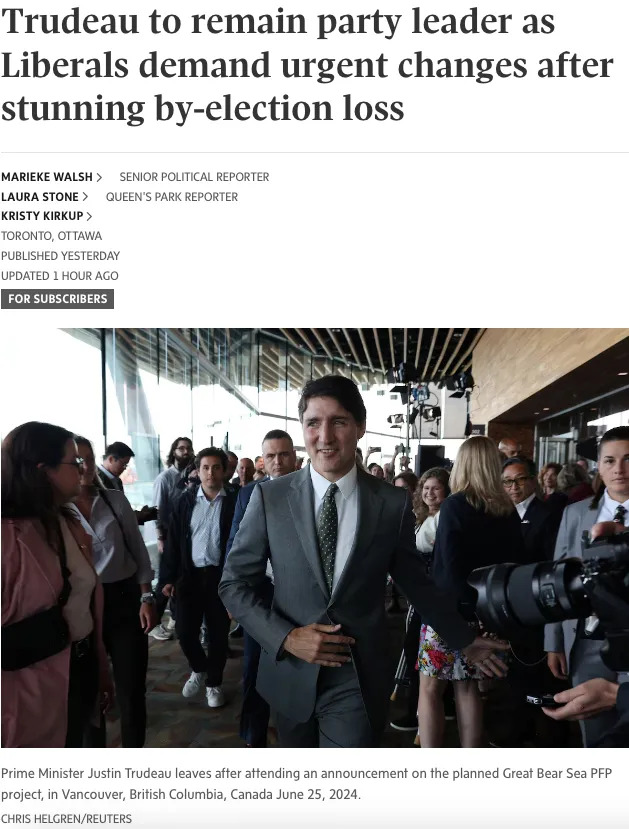 多伦多补选失败后,多名自由党联邦国会要求特鲁多下台,但特鲁多放出信号表示将会继续担任党领一职。多伦多星报罕见登出一篇反特鲁多的观点文章,称:“特鲁多的政治生涯已经结束了,现在他可以有尊严地自己辞职离开,或者留下来被他讨厌的人打败。”