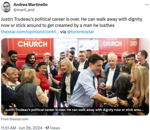 专栏作者安德烈亚·马丁内洛(Andrea Martinello)称:“特鲁多的政治生涯已经结束了,现在他可以有尊严地离开,或者留下来被他讨厌的人打败。”