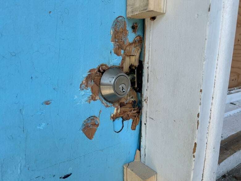 周二,圣雅克汽车旅馆(Motel St-Jacques)的门被损毁。 (Kwabena Oduro/CBC)