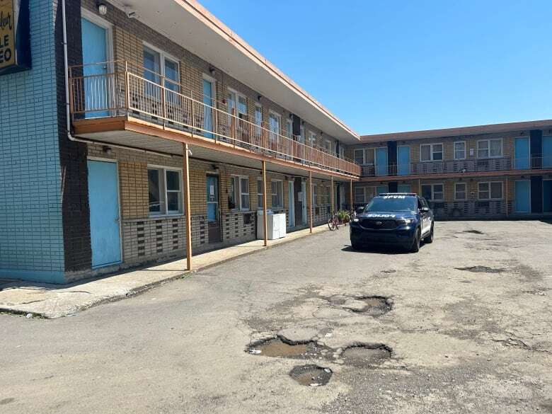 2024年6月25日星期二,一辆警车停在圣雅克汽车旅馆外。当局已控制该建筑。 (Kwabena Oduro/CBC)