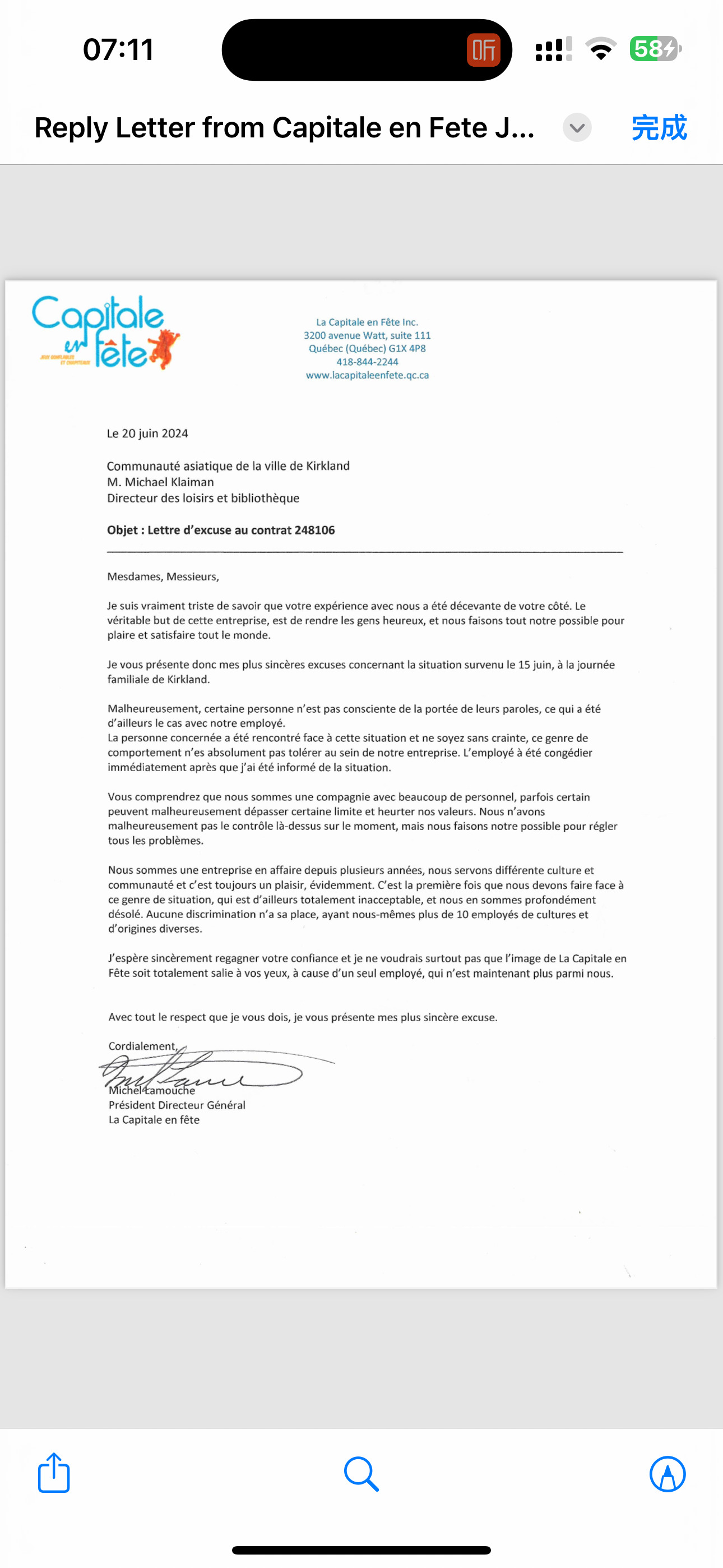 市政在6/28日这天如约给出了之前Kirkland Day那日提供游乐场器材出租的供应商La Capitale en Fête针对他们员工的不当种族歧视言论给出了答复,真的要大赞下Kirkland的市政工作人员们,他们一直有在严肃认真地对待这件事情,且持续跟进并给了大家一个正面的结果。La Capitale en Fête的总裁出具了正式的信函表达了对于该事件的诚挚的歉意,并且已经解雇了该名员工,同时也表达了该公司对于种族歧视零容忍的态度。