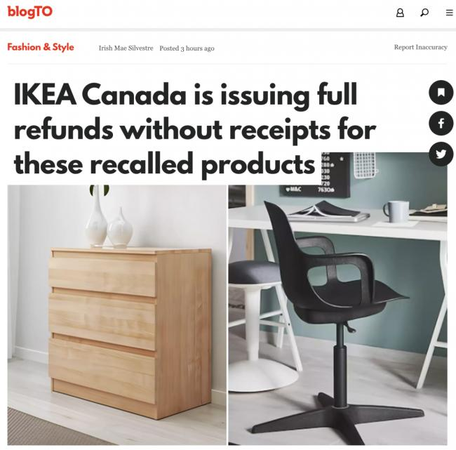 客户可以将受影响产品退还给宜家加拿大门店或联系客户服务,无需提供购买证明。