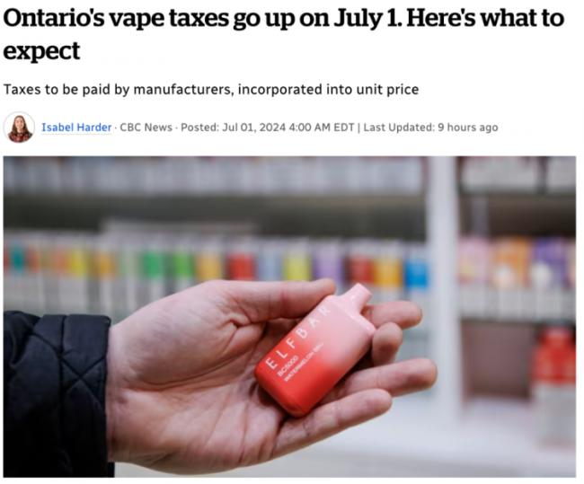 加拿大生产或进口的电子烟产品的税收(Vape Tax)将于 7 月 1 日起上调 12%,各省可选择同步提高税率。
