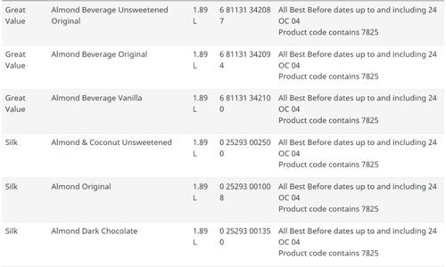 被召回的产品由Danone Canada公司制造,包括多种不同口味和包装的Silk和Great Value品牌植物饮料。