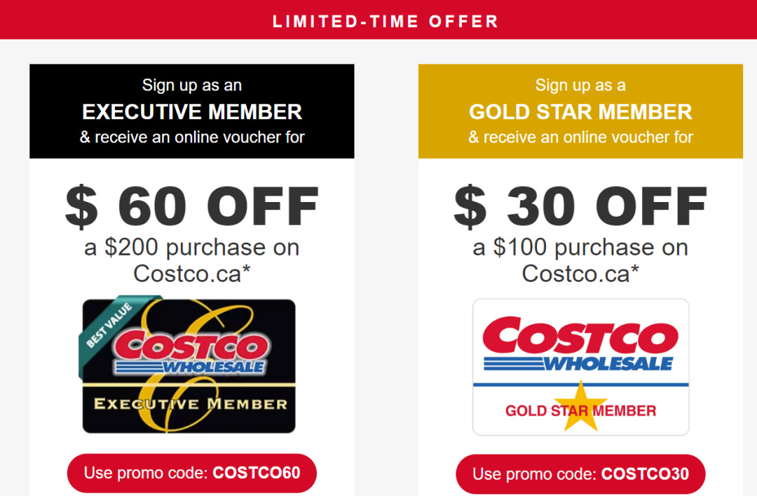 为了吸引更多会员,Costco正在提供限时的新会员注册优惠,包括Gold Star和Executive会员资格,并提供在线代金券。