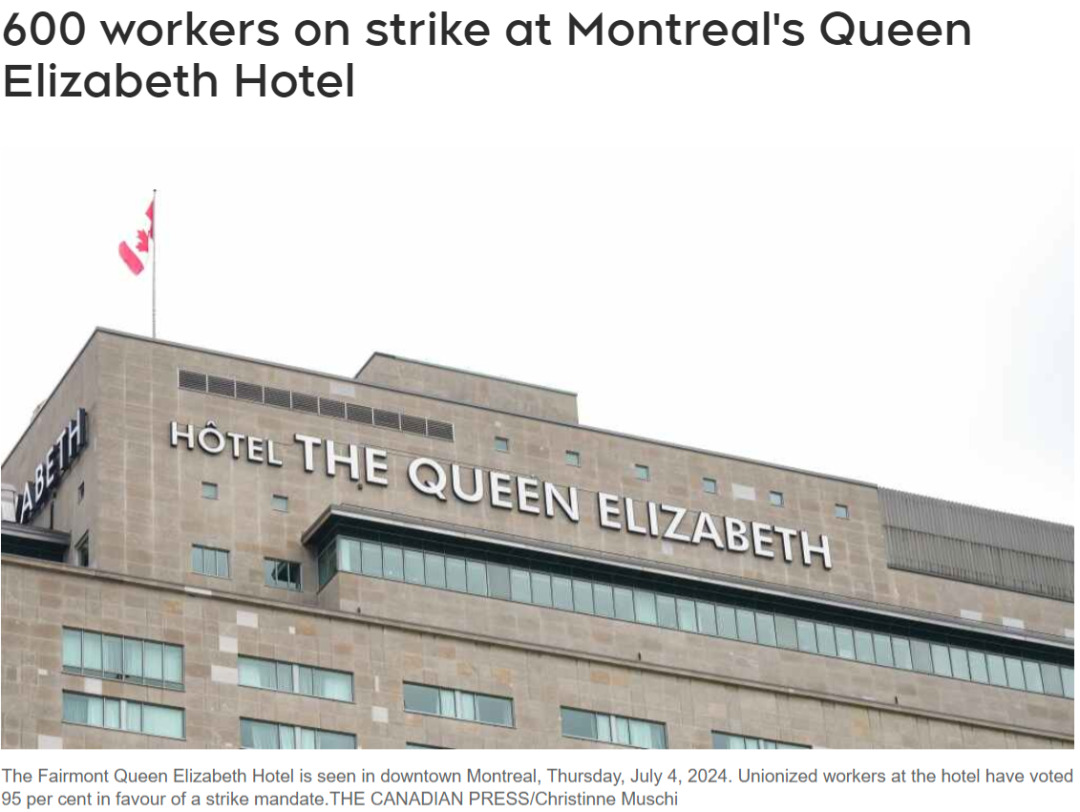 蒙特利尔市中心费尔蒙伊丽莎白女王酒店(Montreal’s Fairmont The Queen Elizabeth Hotel)的工会成员自周一中午开始罢工,罢工将持续到周二中午,以推进续签集体协议的谈判。