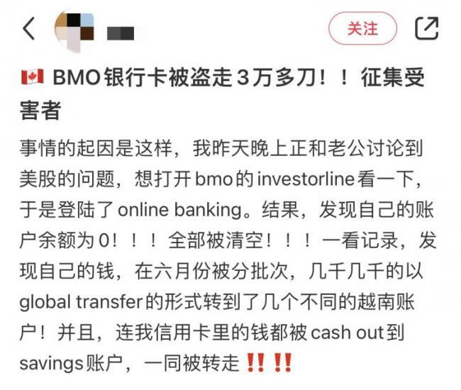 根据爆料称,一位华人近日发现自己的BMO银行卡被盗走3万多刀!当她登录online banking后,发现账户余额为0,全部被转走了。记录显示,钱款被以global transfer的形式转至越南账户,连信用卡里的钱也被转走。这不是博主第一次发现账户被盗,去年也曾有相似情况发生。尽管博主已换取新的银行卡并更改密码,但所有余额依然被盗走。