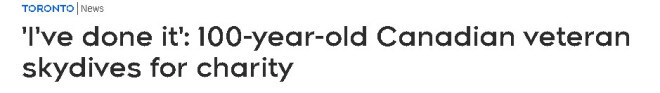Ed Marshall是一位曾在二战期间接受训练的老兵,他在去年12月满100岁后决定进行跳伞。他在安省Cayuga跳伞之前表示期待:“我从未体验过在高空漂浮下降伞的感觉,所以我很兴奋,期待享受这段独特体验。”