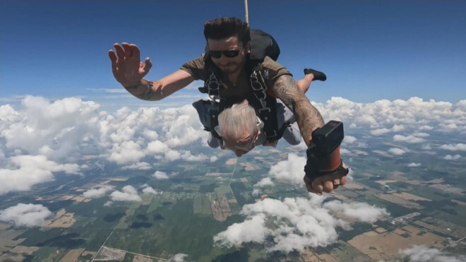 Marshall与加拿大武装部队的资深伞兵Adam Winnicki一起进行了双人跳伞,从近11,000英尺的高空跃下。这个高度比他在二战末期作为加拿大第一伞兵营成员训练时更高。