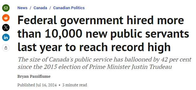 加拿大联邦政府在过去一年里增聘了超过10,000名联邦公务员,使渥太华的官僚机构发展到史无前例的规模。
