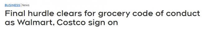 经过多年的激烈协商,加拿大所有的大型杂货商最终同意签署这一自我规制的《杂货行业行为准则》,其目标是促进零售商与供应商的关系。本周,Costco和沃尔玛也加入了这一行列,而Loblaw则在今年5月放弃了之前的反对。